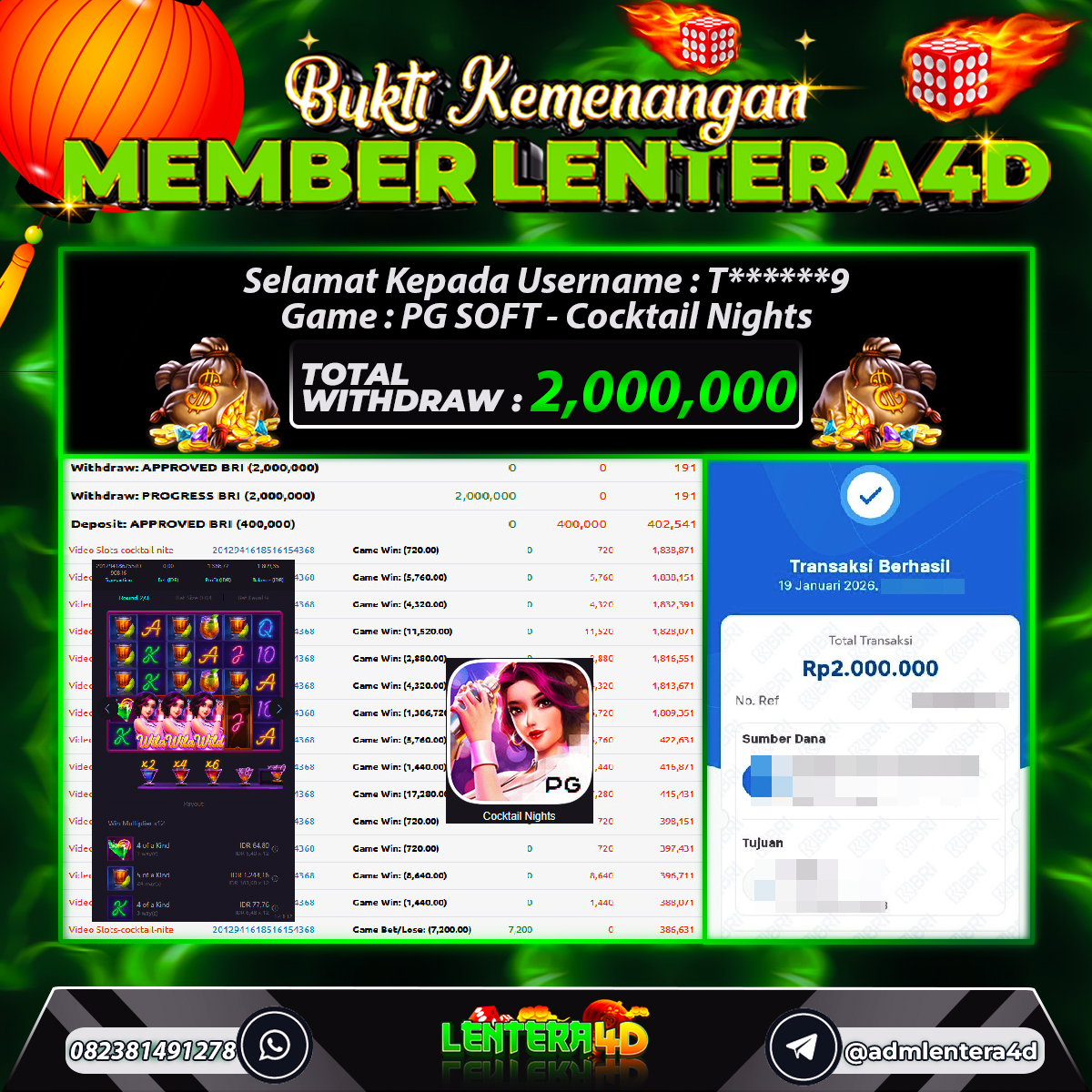 JACKPOT MAIN COCKTAIL NIGHTS 19 JANUARI 2026, Jackpot Slot Gacor, Kemenangan Slot, Bukti Kemenangan Slot, Kemenangan Slot PG SOFT, Menang Slot online, Slot Gacor, Situs Aman Terpercaya, WD Berapapun Pasti DI Bayar Tuntas, Maxwin Slot Online.