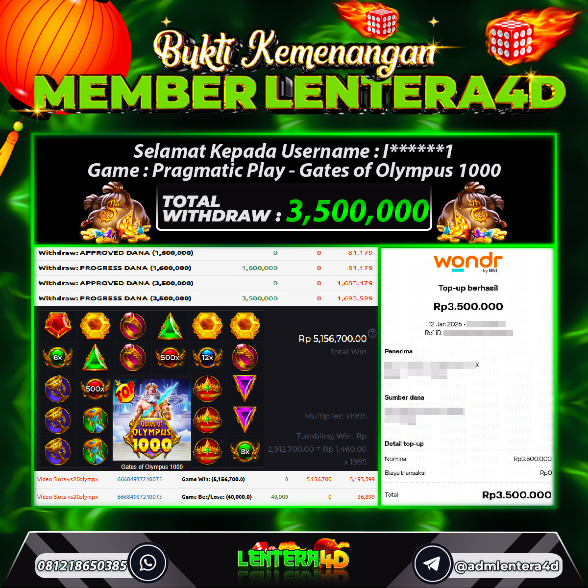 JACKPOT GATES OF OLYMPUS 1000 12 JANUARI 2026, Jackpot Slot Gacor, Kemenangan Slot, Bukti Kemenangan Slot, Kemenangan Slot Pragmatic Play, Menang Slot online, Slot Gacor, Situs Aman Terpercaya, WD Berapapun Pasti DI Bayar Tuntas, Maxwin Slot Online.