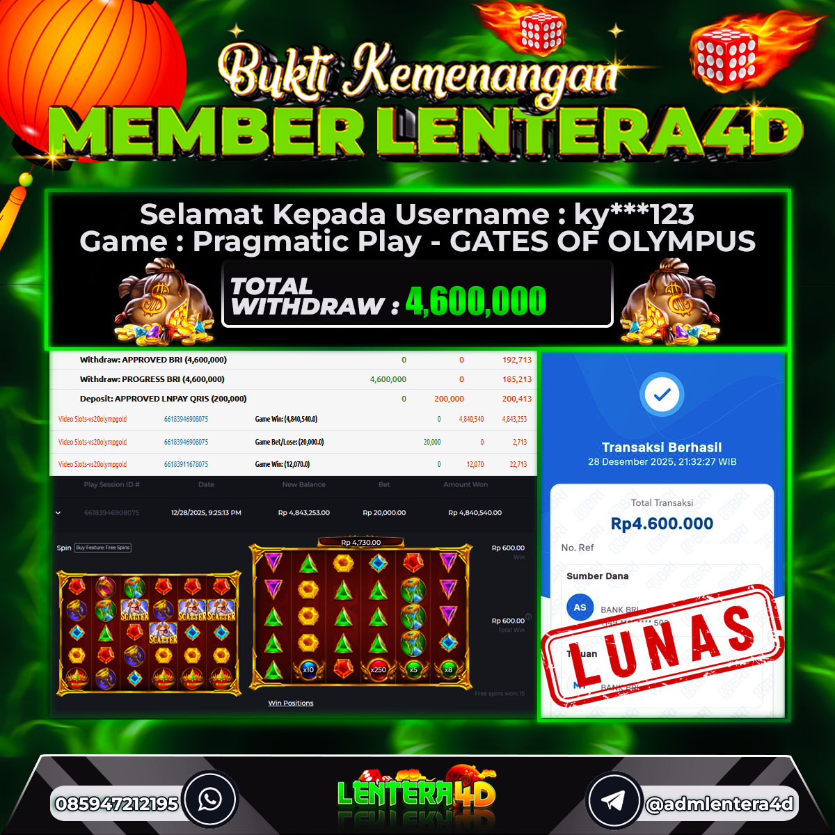 Lentera4D dikenal sebagai situs terpercaya yang selalu menghadirkan pengalaman bermain slot online yang aman, fair, dan berlisensi resmi. Di sini, kami tidak hanya sekadar memberikan janji, tapi bukti nyata berupa slip kemenangan yang dapat Anda lihat secara langsung.