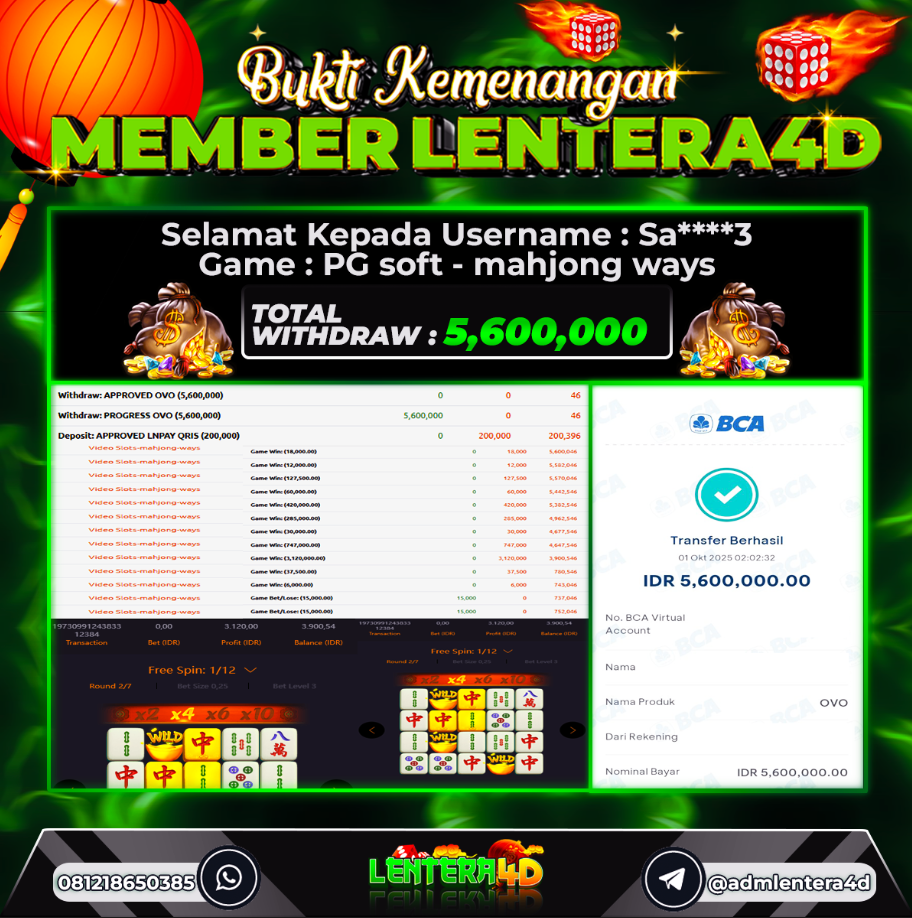 Setiap hari, member Lentera4D berhasil meraih jackpot besar dari berbagai provider slot ternama yang kami sediakan, seperti Pragmatic Play, Habanero, PG Soft, dan masih banyak lagi. Kami secara rutin menampilkan bukti screenshot atau rekapan kemenangan yang berhasil diraih, mulai dari kemenangan ratusan ribu hingga puluhan juta rupiah. Semua slip kemenangan ini kami hadirkan untuk membuktikan bahwa di Lentera4D, peluang menang itu nyata.