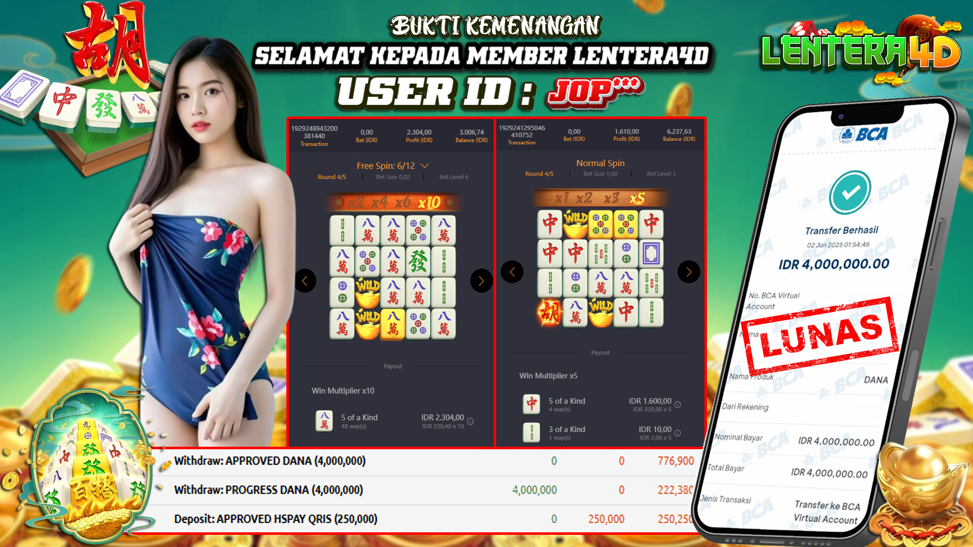 Setiap hari, member Lentera4D berhasil meraih jackpot besar dari berbagai provider slot ternama yang kami sediakan, seperti Pragmatic Play, Habanero, PG Soft, dan masih banyak lagi. Kami secara rutin menampilkan bukti screenshot atau rekapan kemenangan yang berhasil diraih, mulai dari kemenangan ratusan ribu hingga puluhan juta rupiah. Semua slip kemenangan ini kami hadirkan untuk membuktikan bahwa di Lentera4D, peluang menang itu nyata.