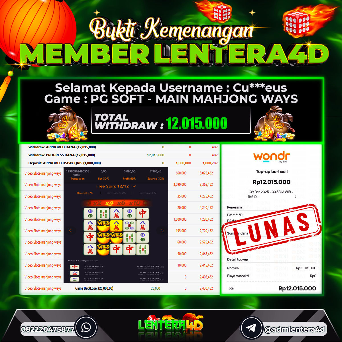 TOTAL KEMENANGAN : Rp. 12.015.000,-