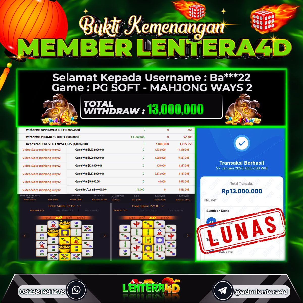 TOTAL KEMENANGAN : Rp. 13.000.000,-