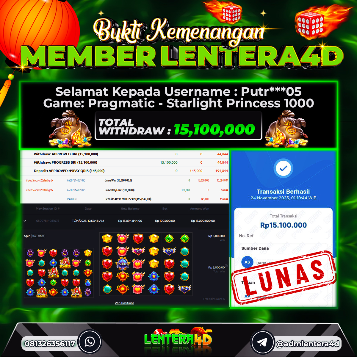 Satu lagi Bukti JP dan Pembarayan Sah Dan Dapat Dipertanggung Jawabkan, WD Berapapun Pasti Dibayar Lunas Hanya di Situs LENTERA4D. Hati Hati Kepada Pihak Pihak Yang Mengatas namakan Pihak LENTERA4D Untuk Melakukan Penipuan.