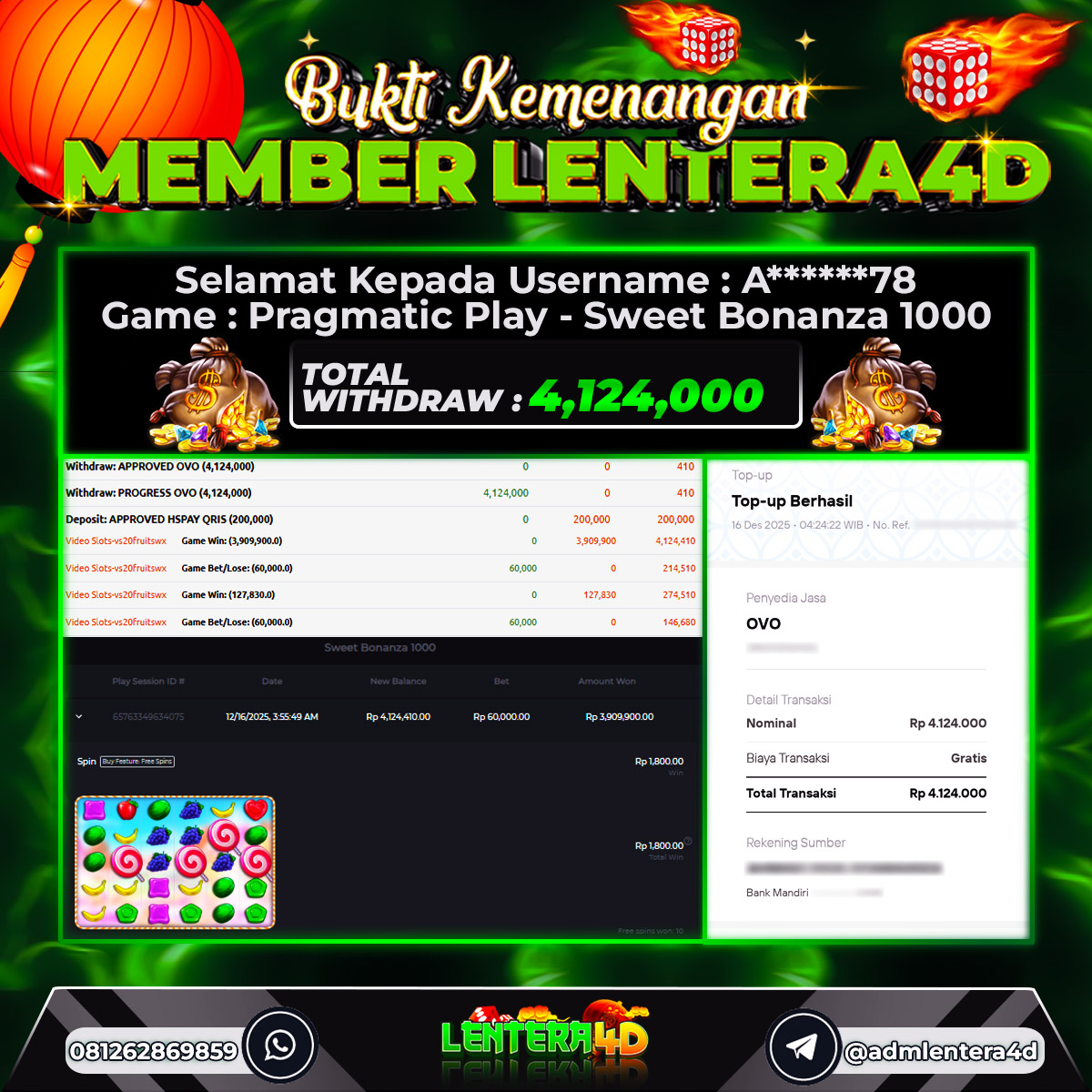 JACKPOT SWEET BONANZA 1000 16 DESEMBER 2025, Jackpot Slot Gacor, Kemenangan Slot, Bukti Kemenangan Slot, Kemenangan Slot PRAGMATIC PLAY, Menang Slot online, Slot Gacor, Situs Aman Terpercaya, WD Berapapun Pasti DI Bayar Tuntas, Maxwin Slot Online.