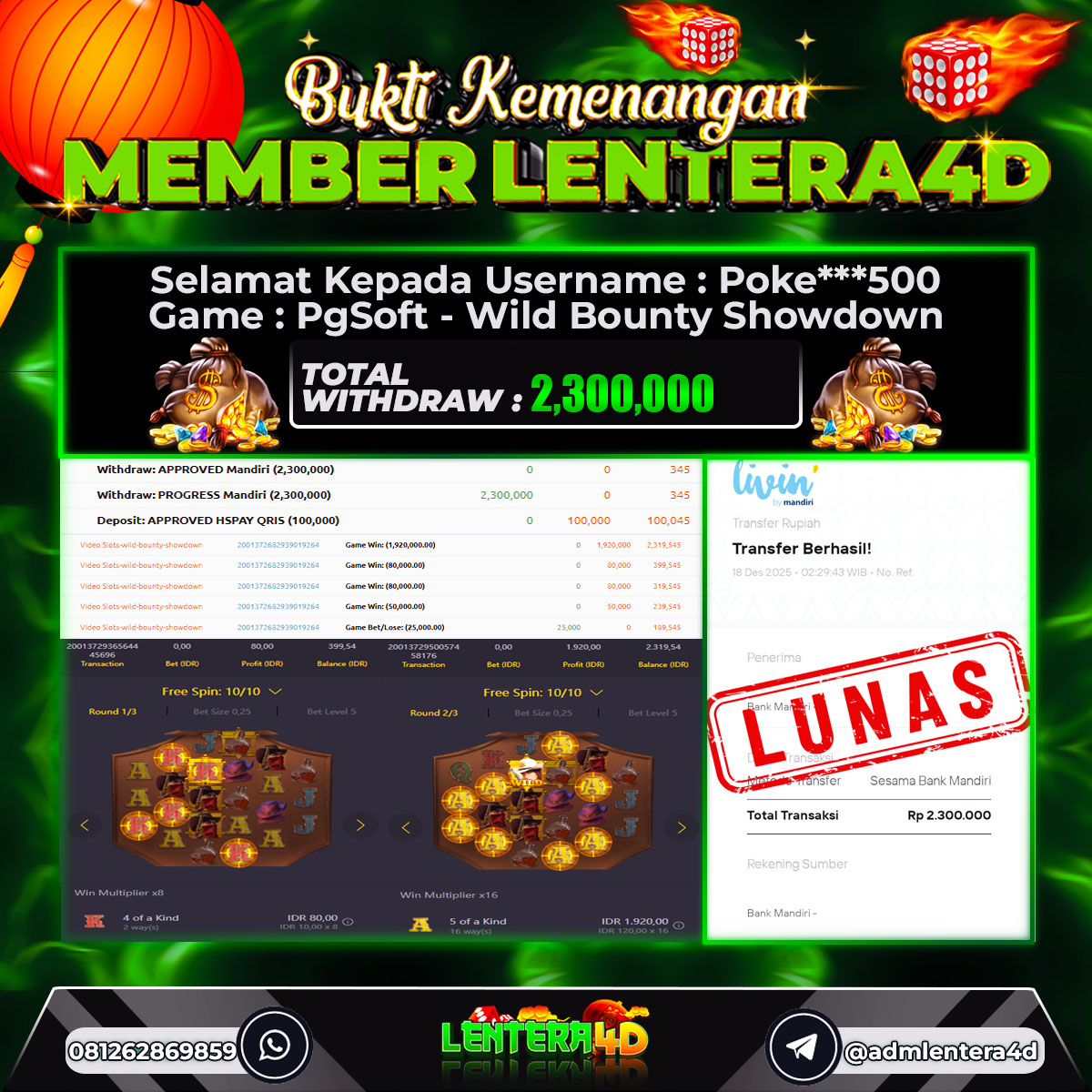 Setiap hari, member Lentera4D berhasil meraih jackpot besar dari berbagai provider slot ternama yang kami sediakan, seperti Pragmatic Play, Habanero, PG Soft, dan masih banyak lagi. Kami secara rutin menampilkan bukti screenshot atau rekapan kemenangan yang berhasil diraih, mulai dari kemenangan ratusan ribu hingga puluhan juta rupiah. Semua slip kemenangan ini kami hadirkan untuk membuktikan bahwa di Lentera4D, peluang menang itu nyata.